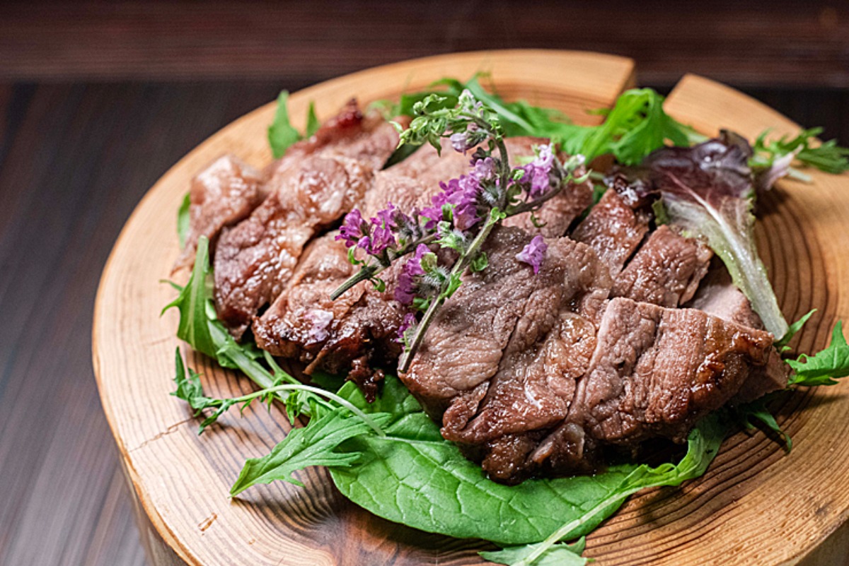 「三好畜産」が育てるブランド肉・姫美豚は、牛に負けない旨みが魅力。赤ワイン醤油で仕上げている
