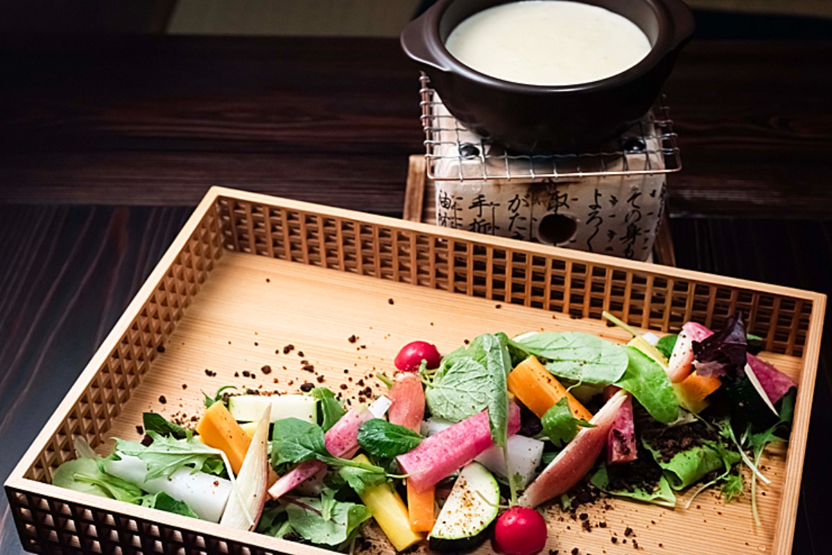 農園をイメージして盛り付けられた、愛媛の新鮮な野菜が約6種。自家製ソースとの相性抜群