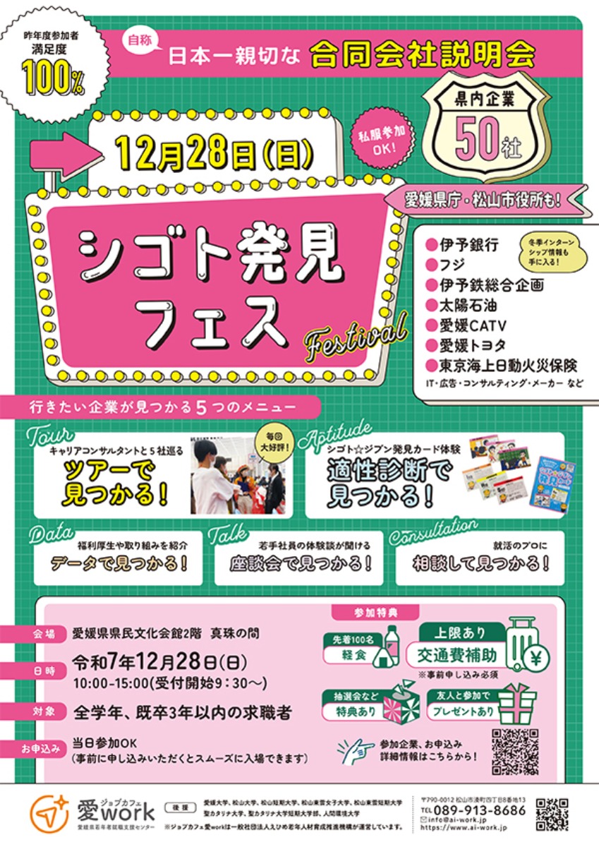 愛媛県県民文化会で開催される年末の合同会社説明会「シゴト発見フェス~就活の軸が見つかる合同会社説明会~」。