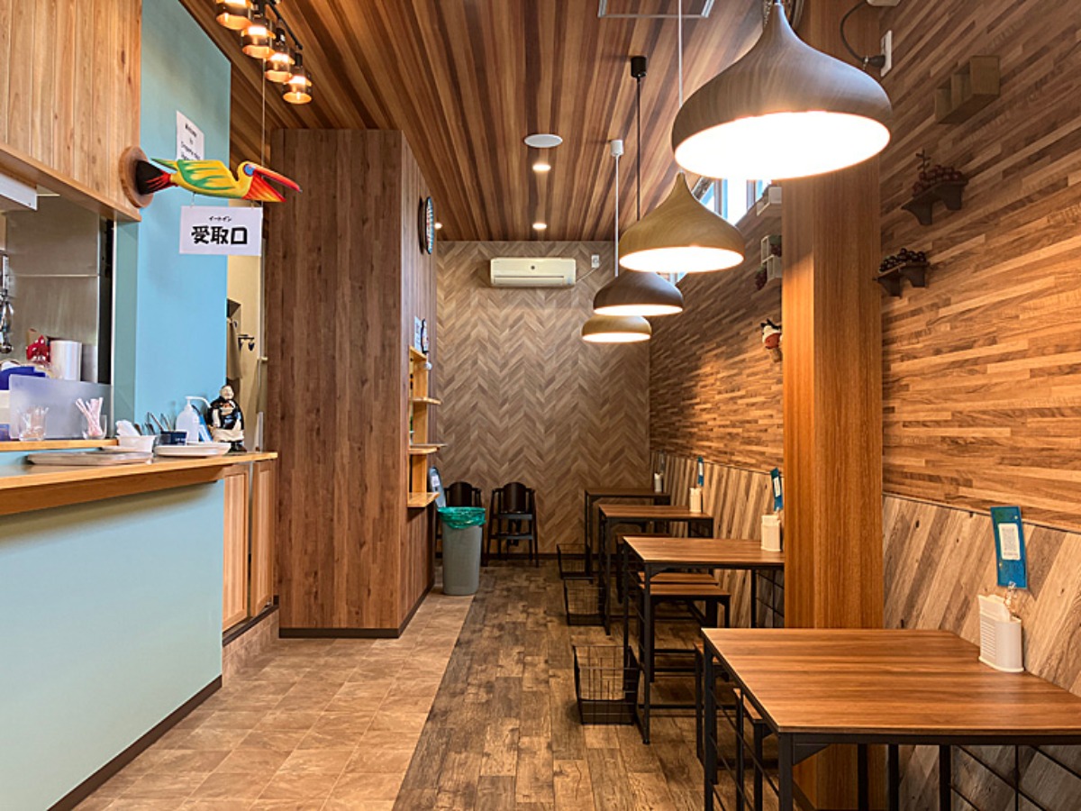 店内はナチュラルブラウンの木目調のテーブルが5席。