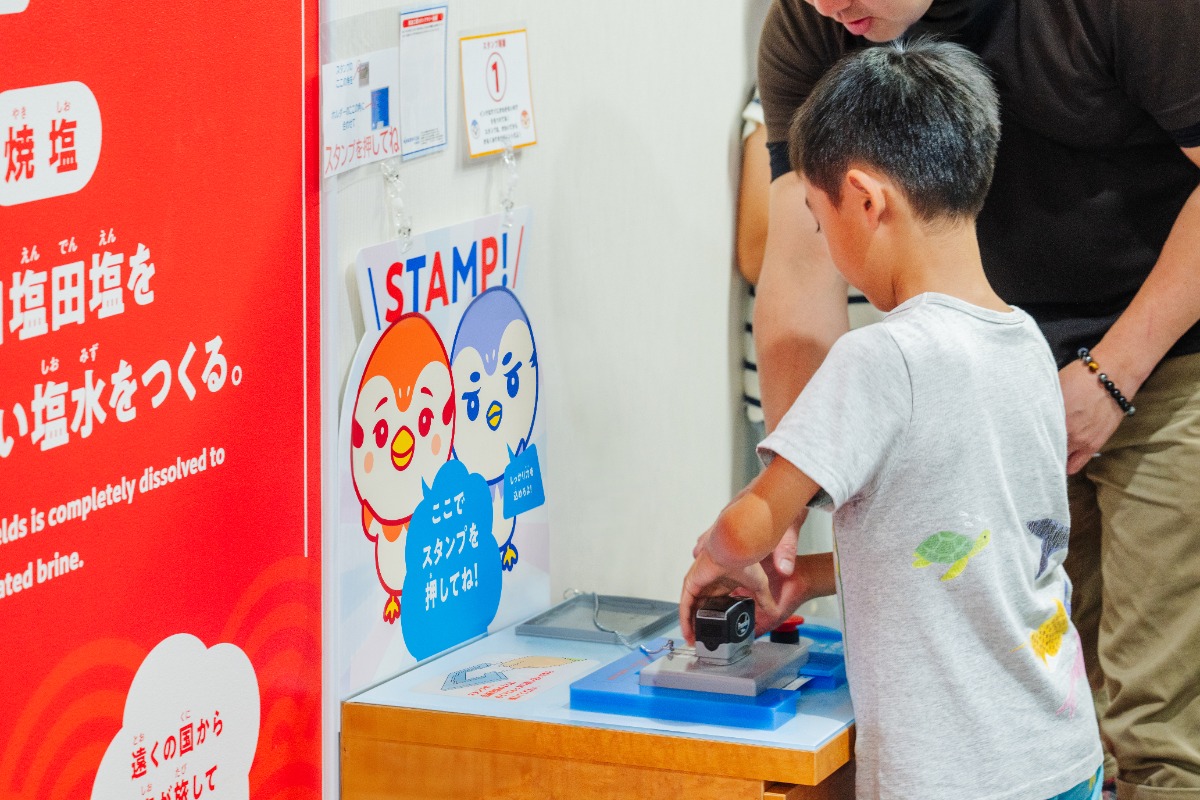 伯方の塩の製造工程が分かるスタンプラリーは、見学窓や解説パネルをしっかり見た証に押してくださいね。全箇所押したら一つのイラストが完成しますよ。どんなイラストができるかはお楽しみに♪