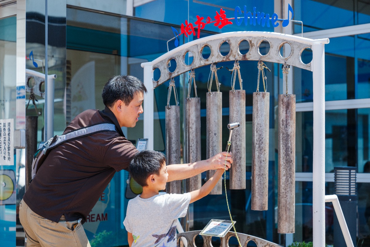 工場に到着したら、まず注目してほしいのが入口前にある「伯方の塩チャイム」。あの有名なCMのジングル「は・か・た・の・しお♪」を、実際に自分の手で奏でることができます!