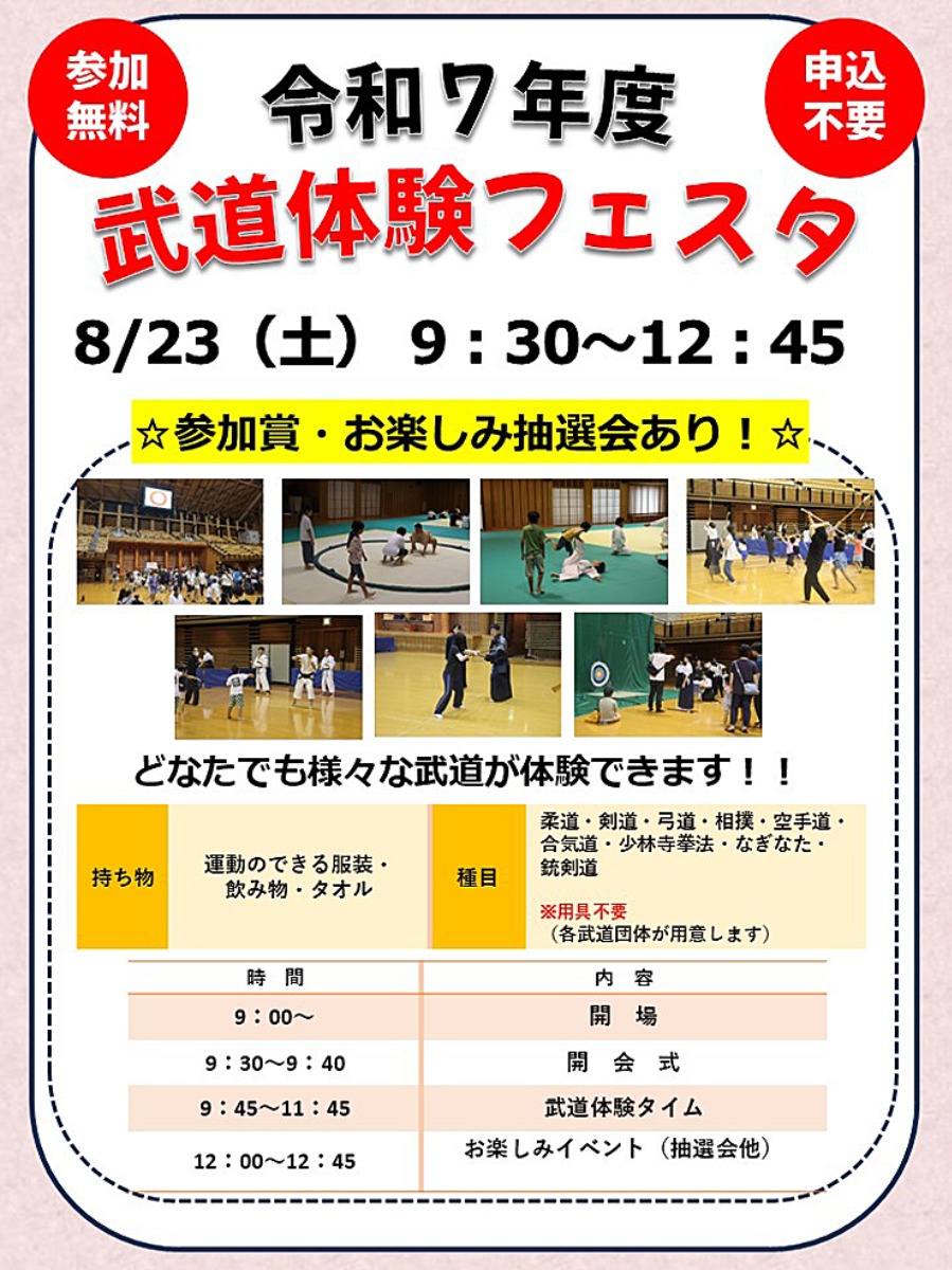 愛媛県武道館で実施される毎年人気の「武道体験フェスタ」が、今年は例年より少し早い2025年8月23日(土)開催となります。