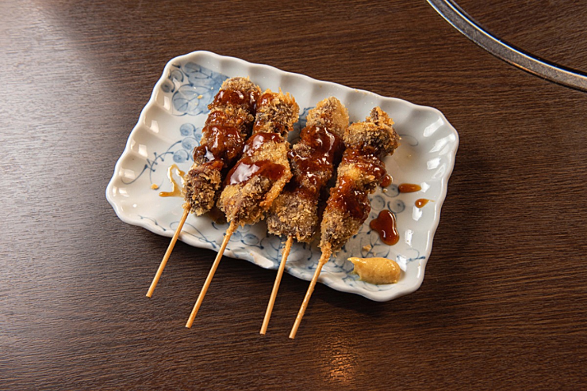 濃厚な肝を串揚げして、ソースとカラシをつけると、食べる手が止まらない!