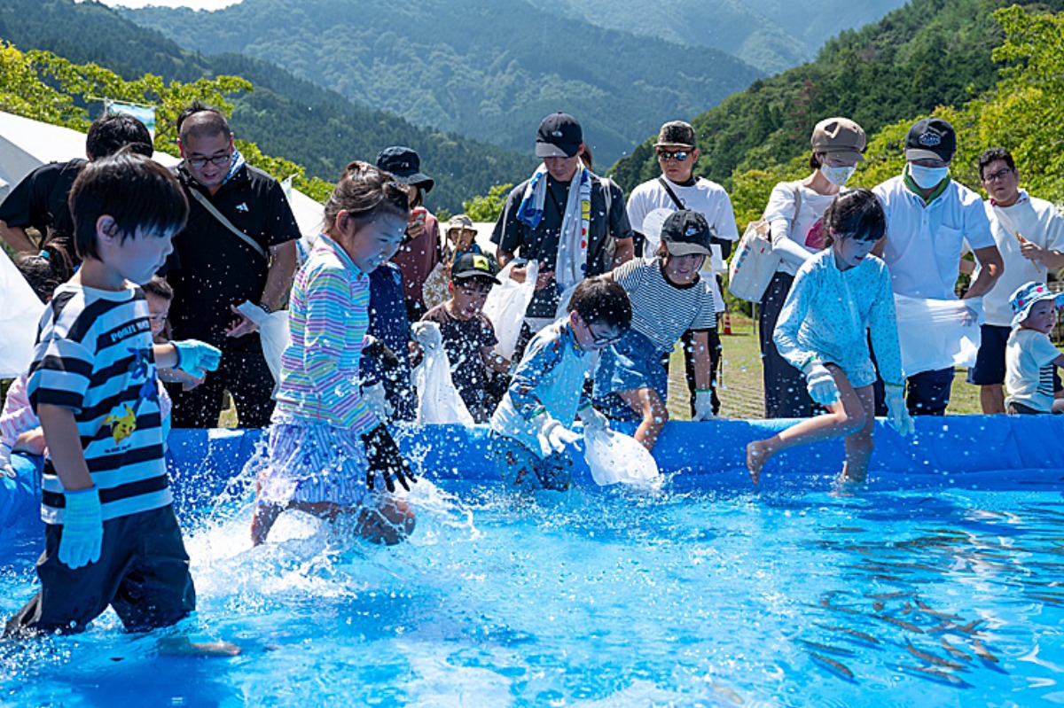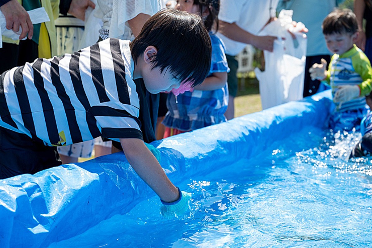 目玉イベントのひとつ「アメゴのつかみ取り」は、幼児や小学生が特設プールで元気いっぱいに挑戦できる人気の体験。