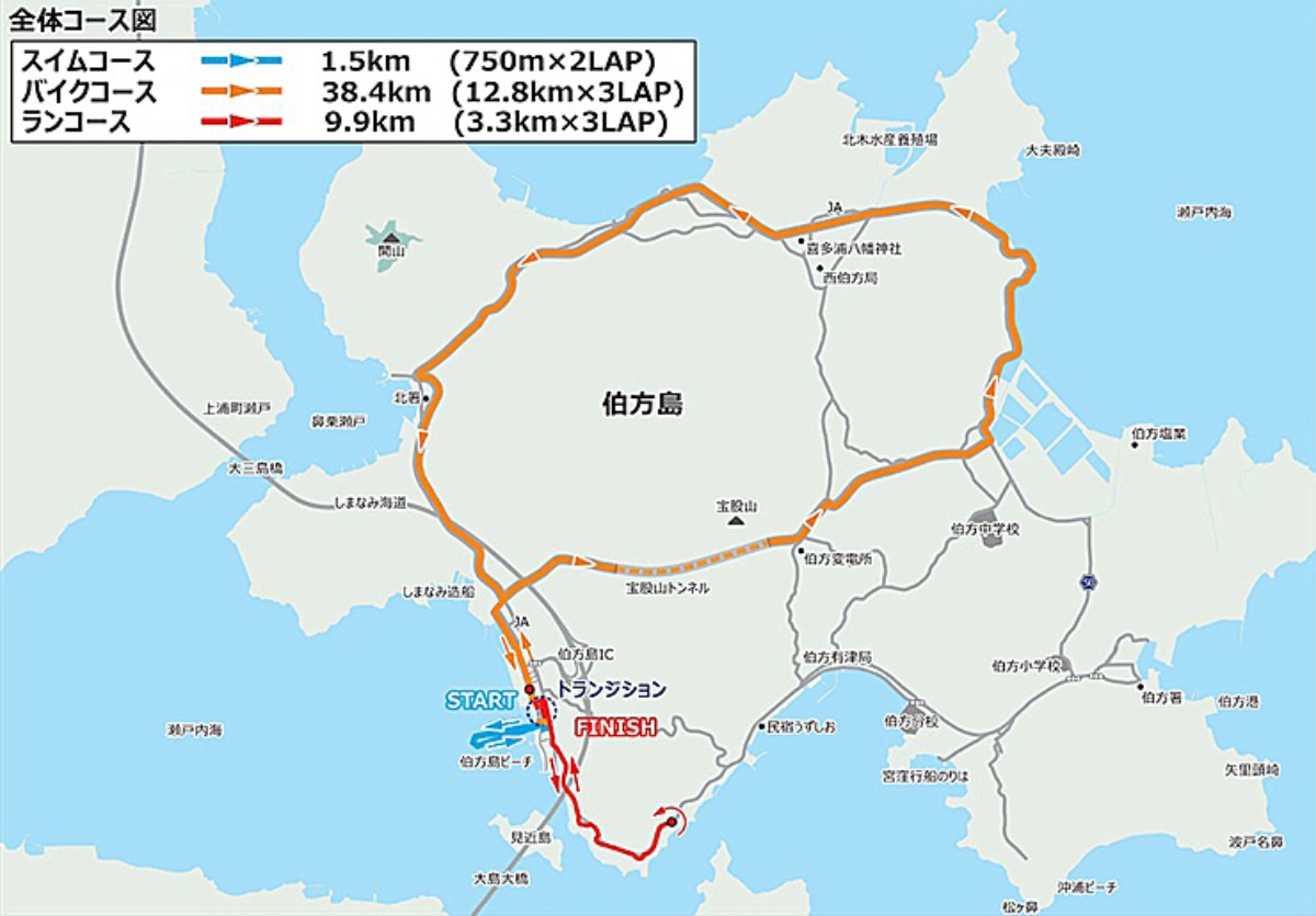 スイムは伯方ビーチの750m特設コースを2周、バイクはトンネルや高低差のある12.8kmの周回コースを3周、ランも島の景観を楽しみながら3周するレイアウトとなっています。
