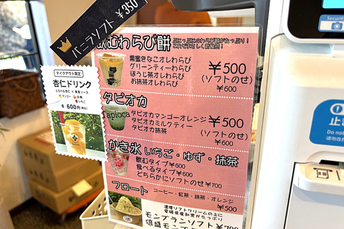 人気のモンブランソフトや飲むわらび餅もあり、