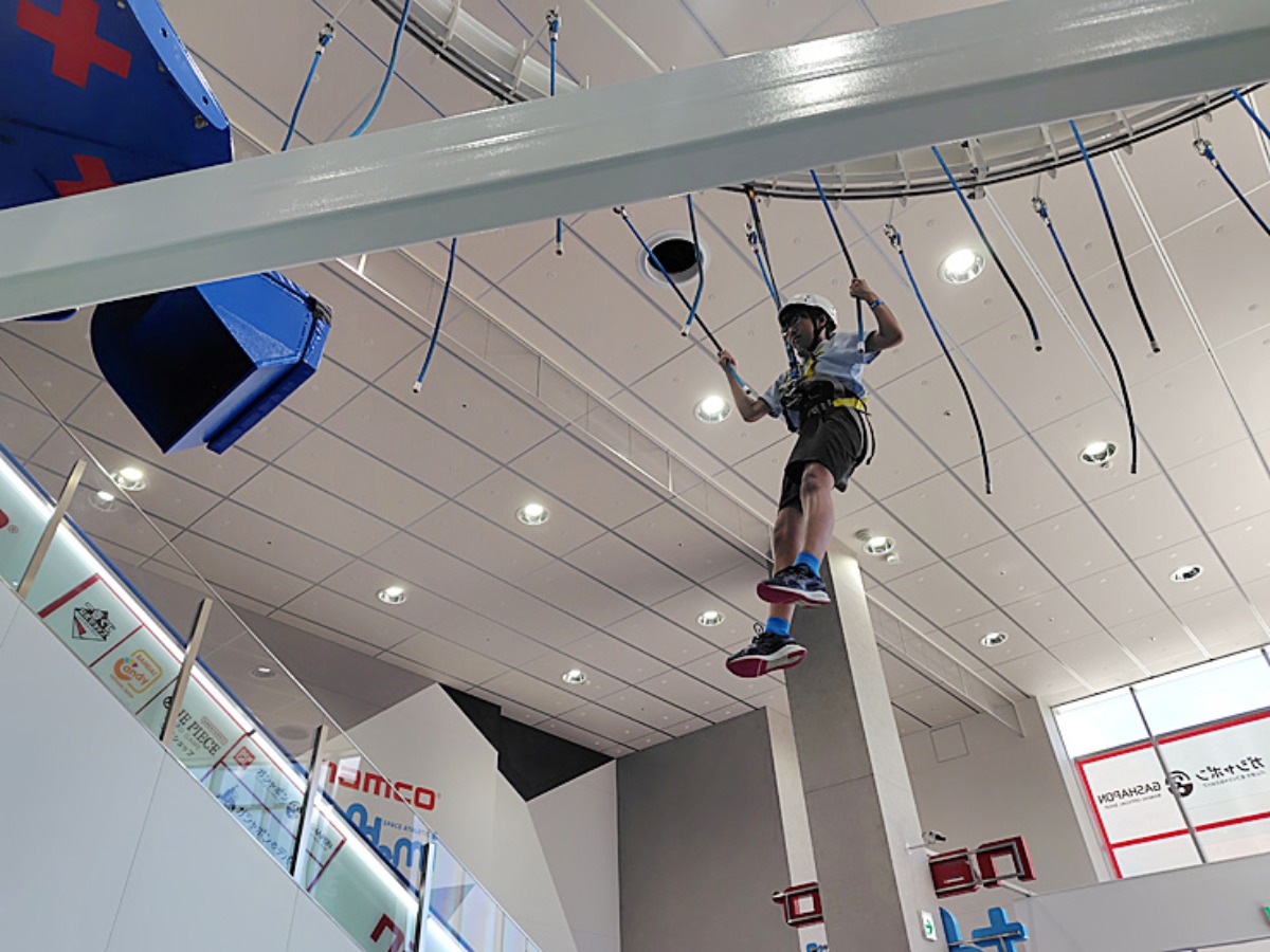 こちらも事前に動画でレクチャーを受け、ロープの引っ張り方やてっぺんからの降り方などを学び、まずは練習用のはしごへ。