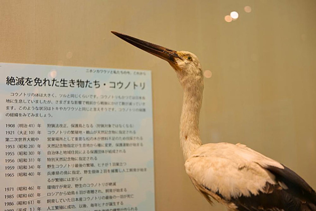 特別展では、絶滅の危機を迎えるも『再導入(保護・増殖して自然界に戻すこと)』が成功し、野生復帰が叶ったトキやコウノトリの事例が展示されています。