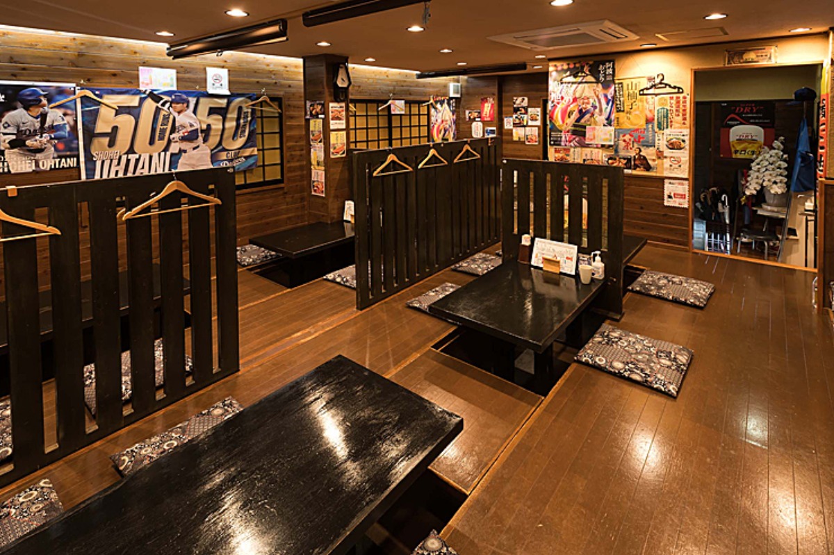 隣との距離感もほど良い、掘りごたつのテーブル席。最大45人までの貸し切りも可能