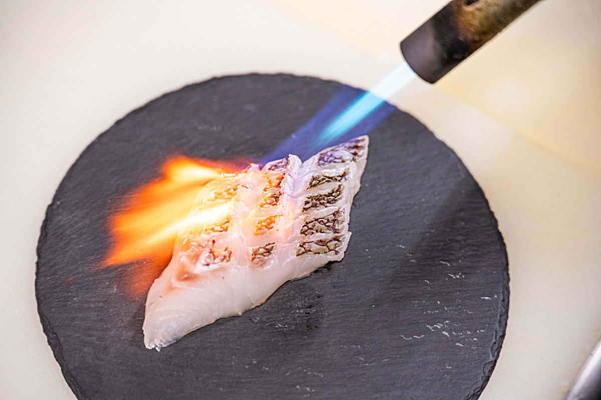 ブランド鯛「白寿真鯛ゼロ」の皮目を炙って香ばしく仕上げる。