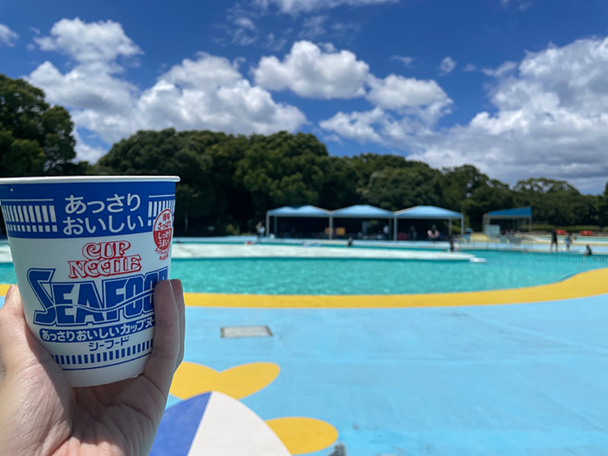 私としては、欠かせないのがプールで食べるカップラーメン!