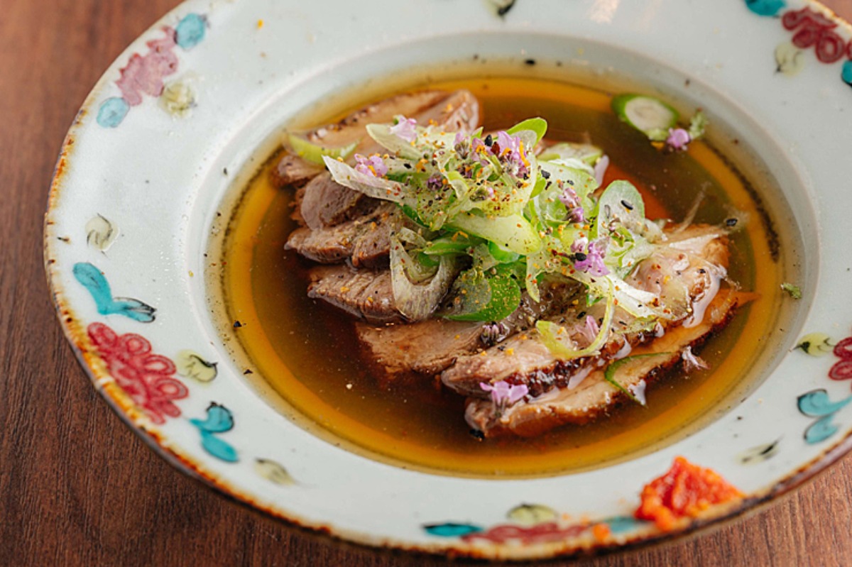皮目を炭火で炙った「合鴨のロースト」は、しっかりとした肉感で食べ応え◎。焼き目の香ばしさ、鴨肉の旨み、ダシが調和する一品だ。