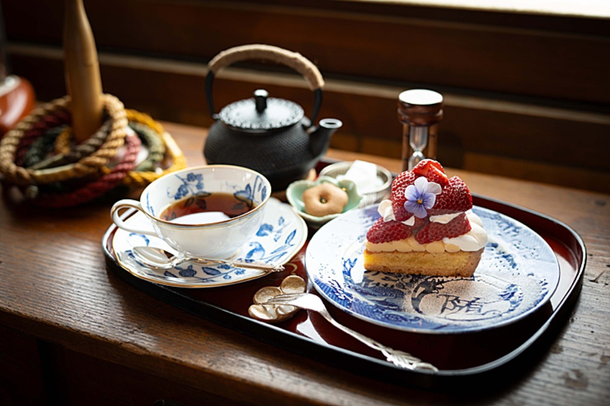 写真は果実たっぷりの「山盛りいちごタルト」。見た目にもおいしそうなタルトと紅茶、鉄瓶の組み合わせにも注目です。