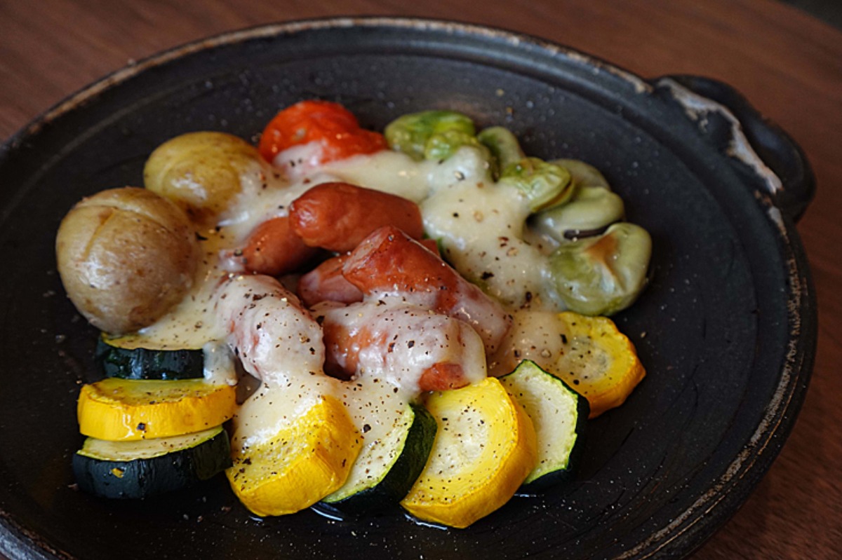城川ソーセージと季節の野菜に、酒かすを使ったチーズをかけた「SAKEチーズフォンデュ」