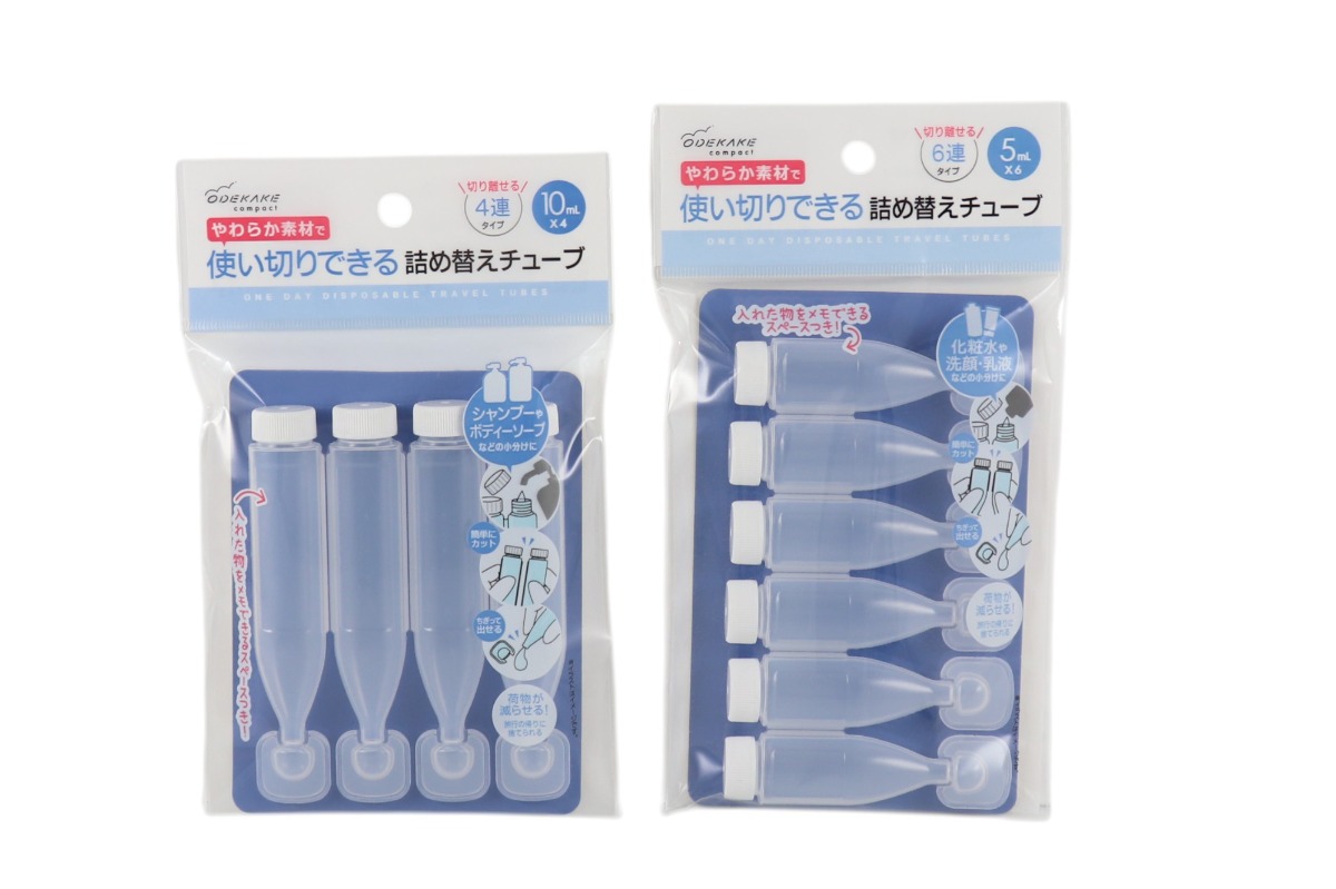 夏の旅行や秋のピクニックにぴったりの「連結詰め替えチューブ(10ml・5ml)」は、スキンケアやシャンプーなどを少量ずつ持ち運べる便利アイテムです。
