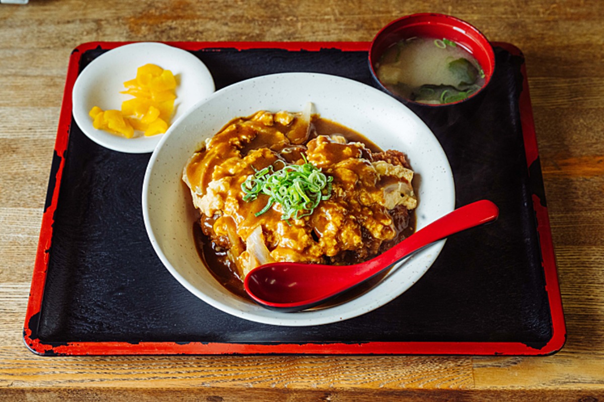 かつ丼にカレーをかけた、常連の声から生まれた個性派メニュー。卵が味を優しくまとめる