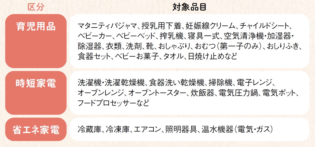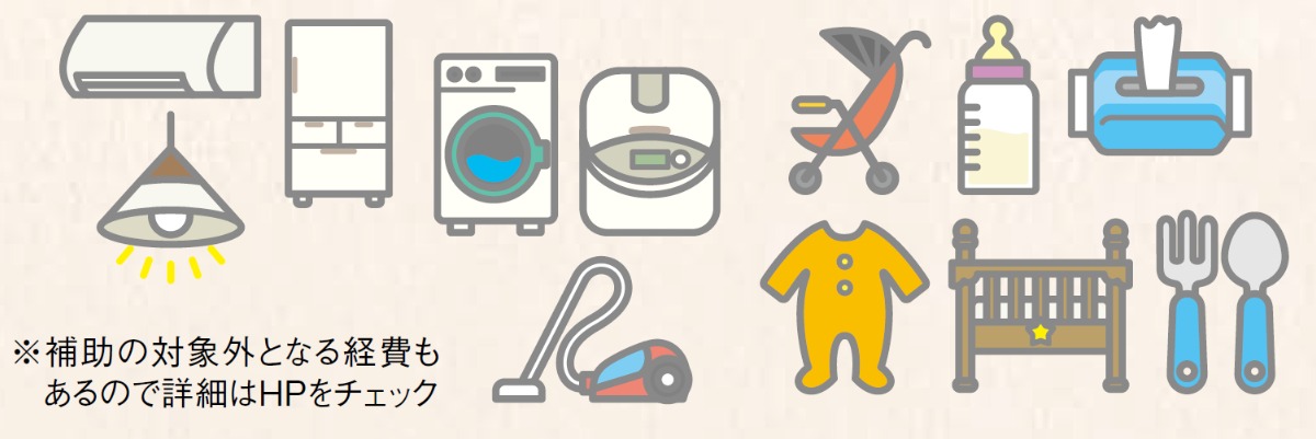 経済的な理由で出産を諦める家庭をなくすため、育児用品や省エネ家電などの購入費の一部を助成。