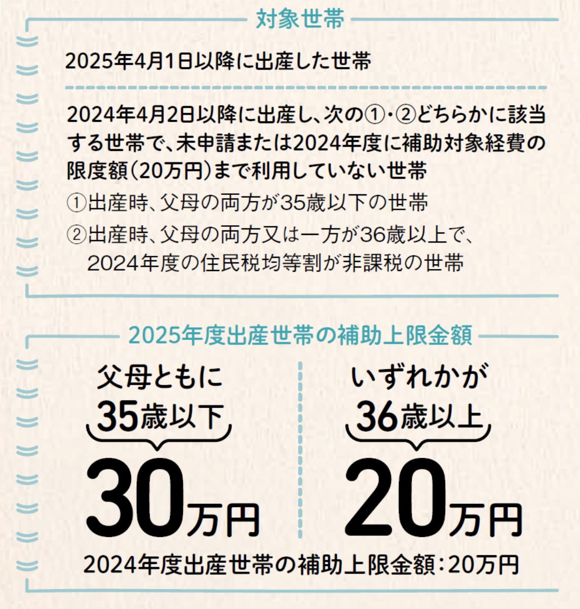 今年度は、出産時の年齢や所得による制限がなくなり、より多くの世帯がこの制度を利用できるようになりました!さらに、父母ともに35歳以下の世帯については、補助対象経費の上限額が拡大されるなど、サポート内容がより手厚くパワーアップ。
