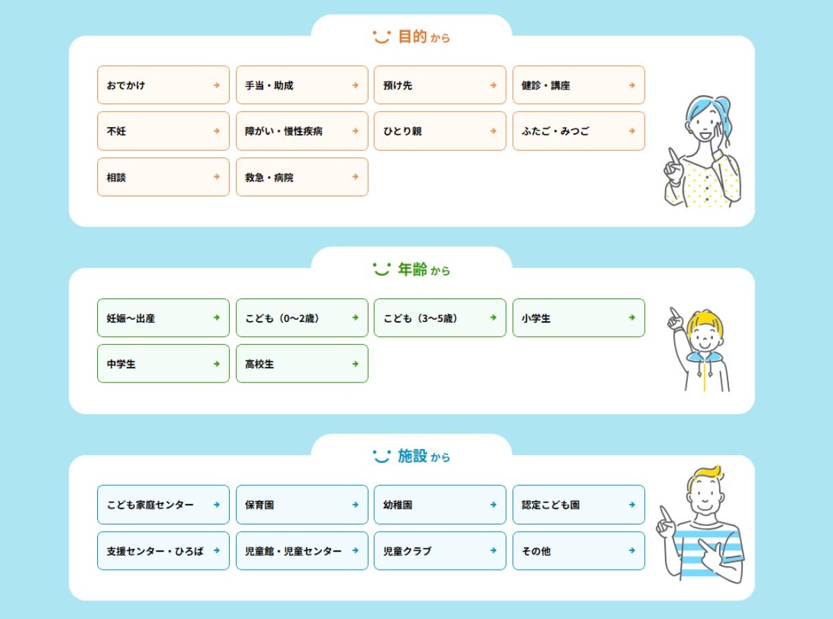 年齢(0~2歳や小学生など)・目的(おでかけや預け先など)・施設(保育園や支援センターなど)から情報を絞って検索できるので、知りたい情報に簡単にたどり着くことができます!外出先でも手軽にアクセス可能です。