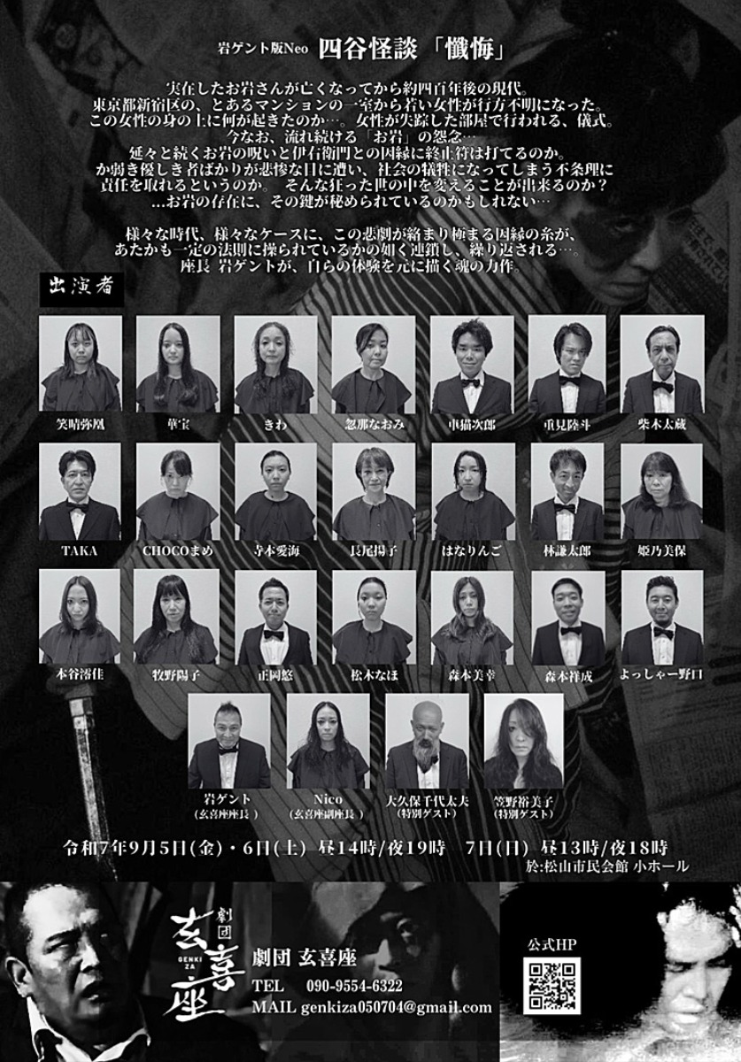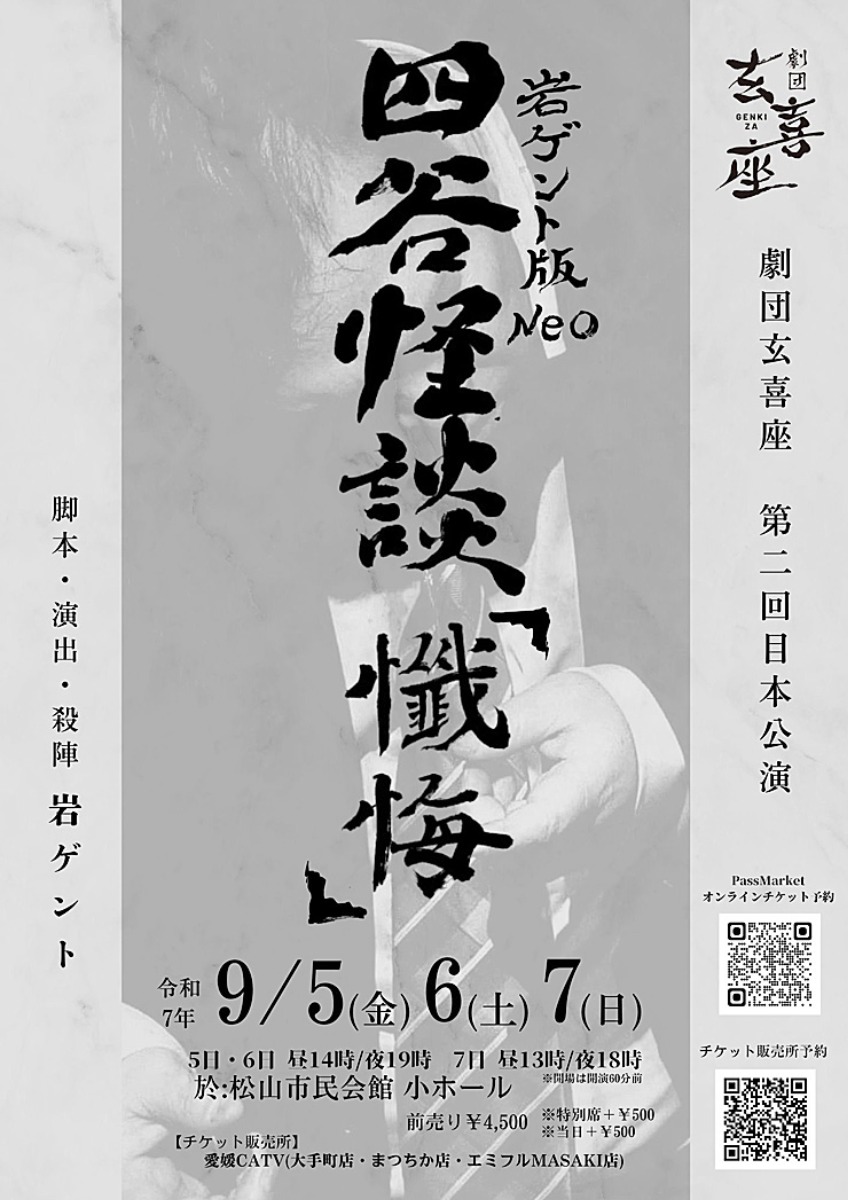 2025年の秋、松山市民会館 小ホールにて劇団玄喜座による待望の第2回本公演「岩ゲント版 Neo 四谷怪談『懺悔』」が開催されます。
