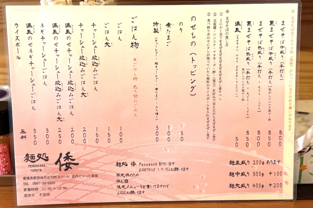 メニューの裏面。まぜそばやチャーシュー炊き込みご飯も人気。