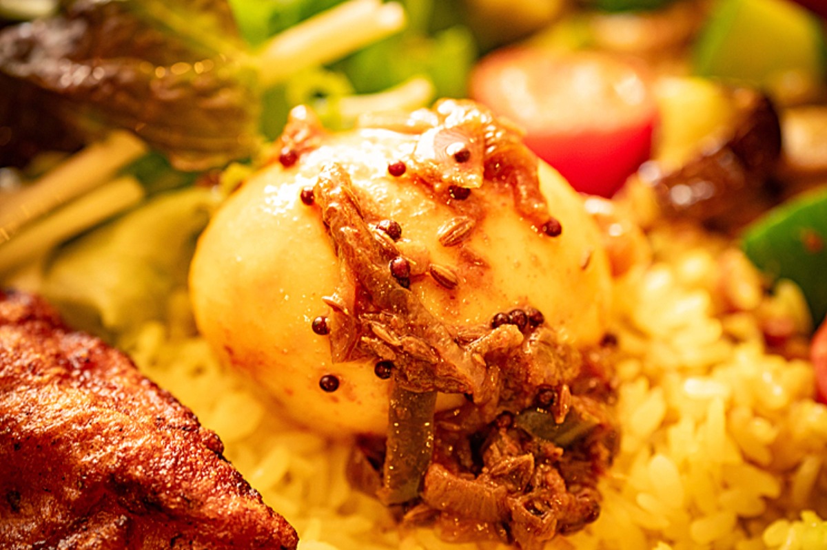 スパイスと野菜で作った液に漬け込んだ半熟の「スパイス卵」(+200円)。