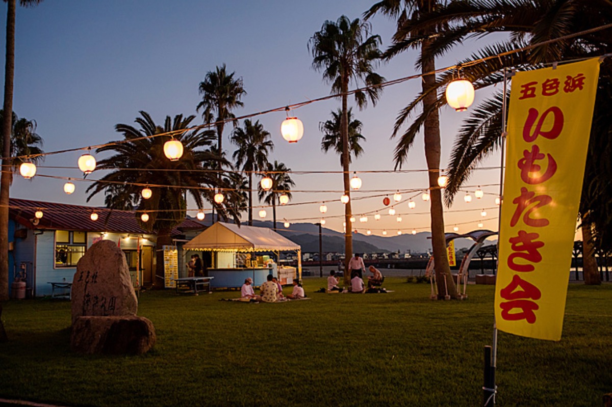愛媛県の秋の風物詩“いもたき”。通常、河川敷で行われることが多いイベントなのですが、愛媛県伊予市で行われる「五色浜観月いもたき」は、「五色姫海浜公園」で開催されます。潮の香漂う海浜公園の芝生の広場には約250席が並びます。手ぶらで参加OK。みんなでわいわいと“いもたき”を楽しみませんか。