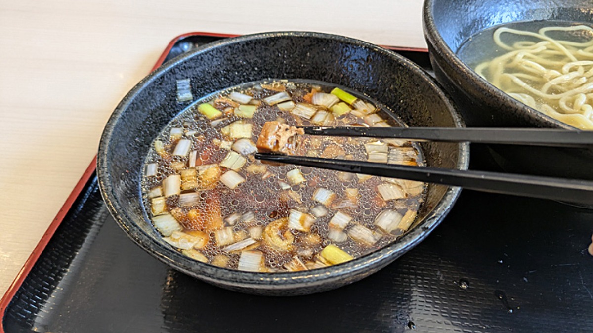 冷たい麺を熱々のスープにつけていただきます。