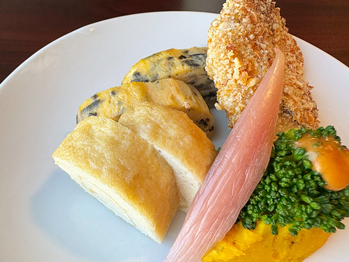 いくつかおかずのご紹介をさせてください♪こちらはちょこちょこといろんなおかずが楽しめる一皿となっています。時計回りに右上から鰆の香煎焼き・かぼちゃのパテ・しのだ巻き・ひじき玉子。どれも丁寧に作られているのが食べていて伝わってきます。ゆっくり噛みしめながら味わいたいそんな一皿でした♪