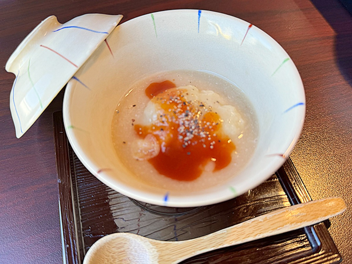この色鮮やかなお料理はじゃがいも饅頭です!トロッとした峰岡餡がかかっており、その上にはなんとトマトソースが!ねっとり食感のじゃがいも饅頭にミルキーな峰岡餡。これに爽やかなトマトソースが合うのかと半信半疑でしたが、相性抜群でかつ上品なお味でおかわりしたくなる美味しさでした♪庖厨めいさんでは「新しく」を大切にされているそうです。