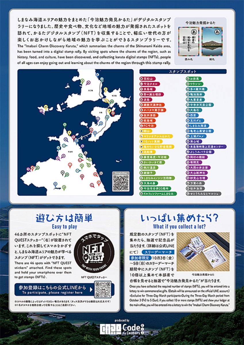 本イベントの最大の特徴は、今治市全域に広がる46カ所のスポットを巡りながら、デジタルスタンプ(NFT)を集めていく点にあります。