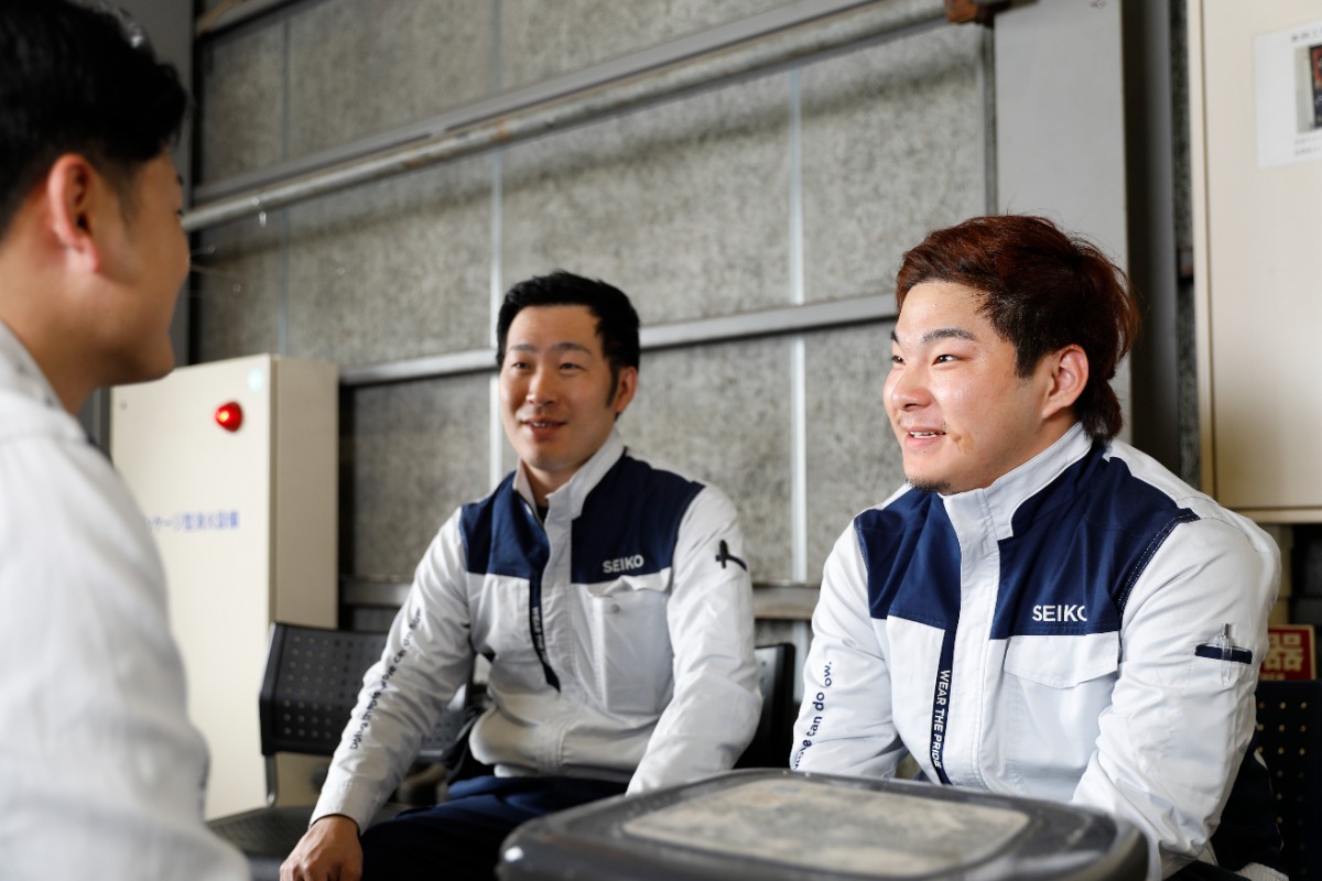 入社後、基礎から学び、現在は製品の穴あけや面取り等の加工作業を担当している三ツ井さん。仕事の指導だけでなく、休憩中はいろんな話を聞いてくれ、声掛けしてくれる先輩たちに囲まれている。