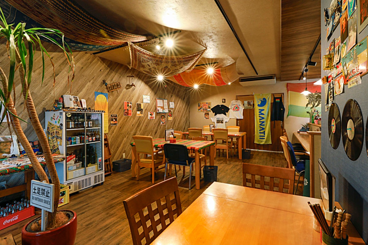 ジャマイカカラーで明るい印象の店内。テーブル席とカウンター席がある