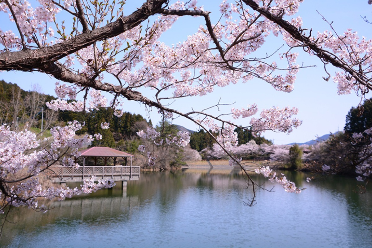 春には池の周囲に咲く桜が水面に美しく映り込む絶景が広がり、あずま屋からの景色は格別。