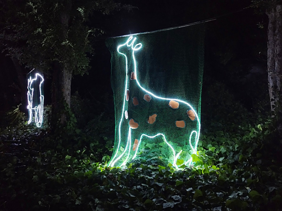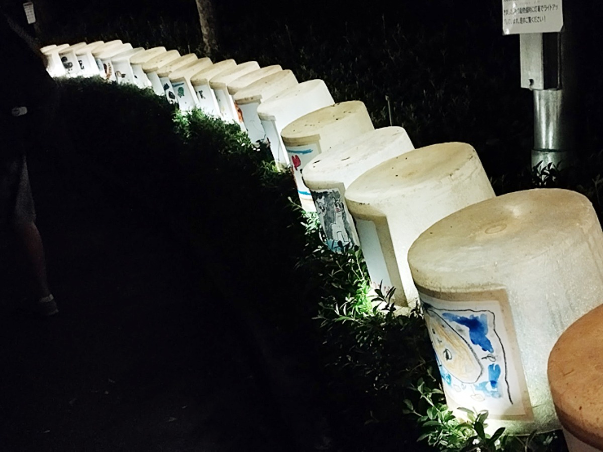 入場ゲートに入ってすぐのライトアップに、子供達が描いた動物のイラストが1枚1枚貼り付けられたコーナーも。