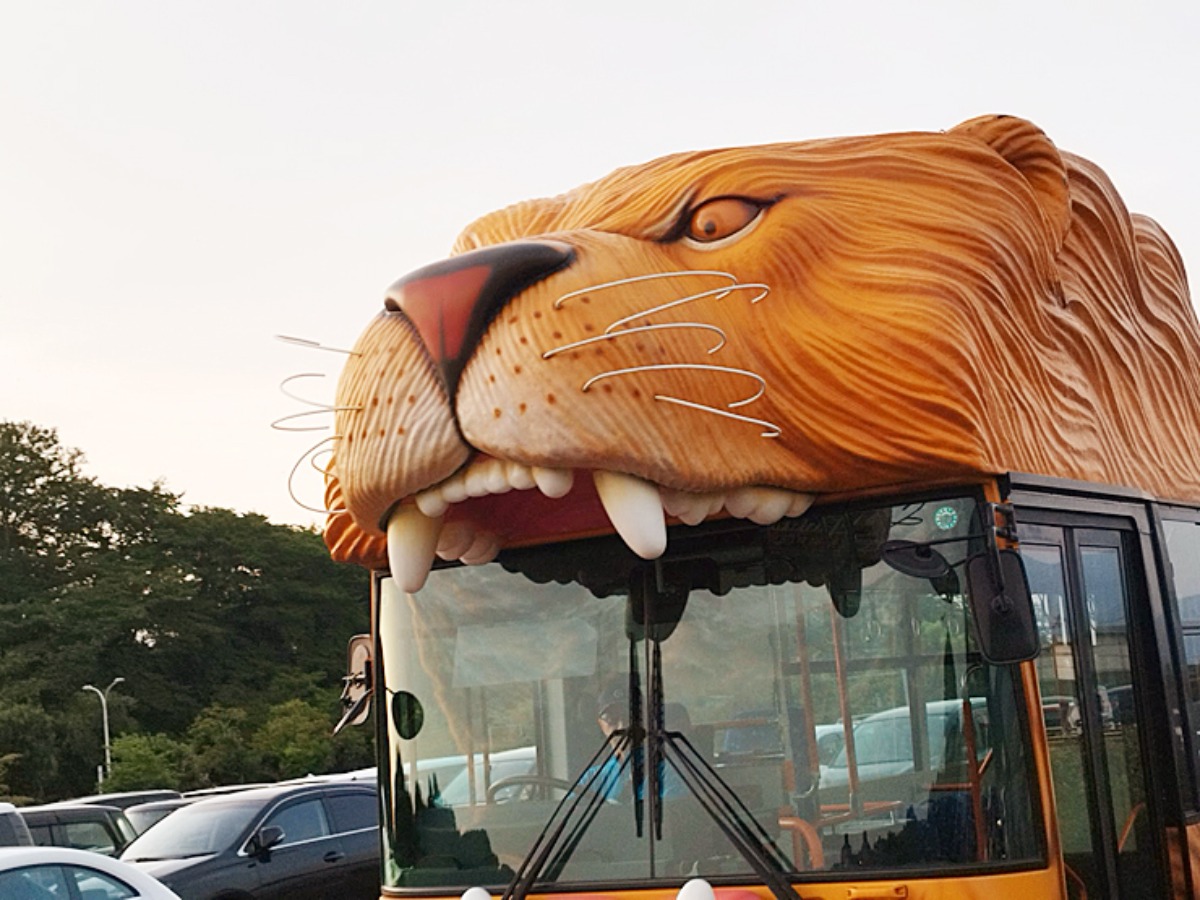 迫力満点のライオンバスに乗っていざ、出発!