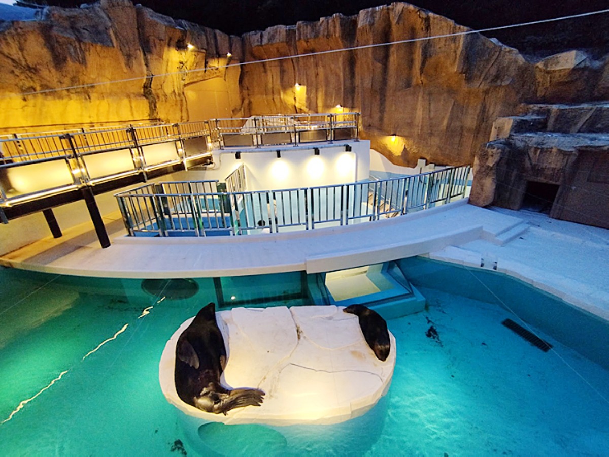 2021年にリニューアルされたアシカ舎は美しいライトアップが施され、さながらアシカが舞台の主役となって登場したかのよう。