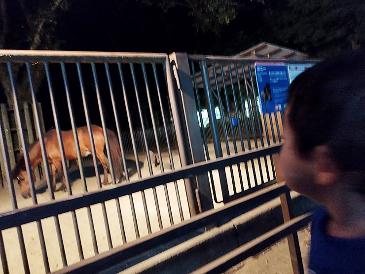 ポニー発見!闇夜に突如現れたお馬さんに息子氏も興味津々。