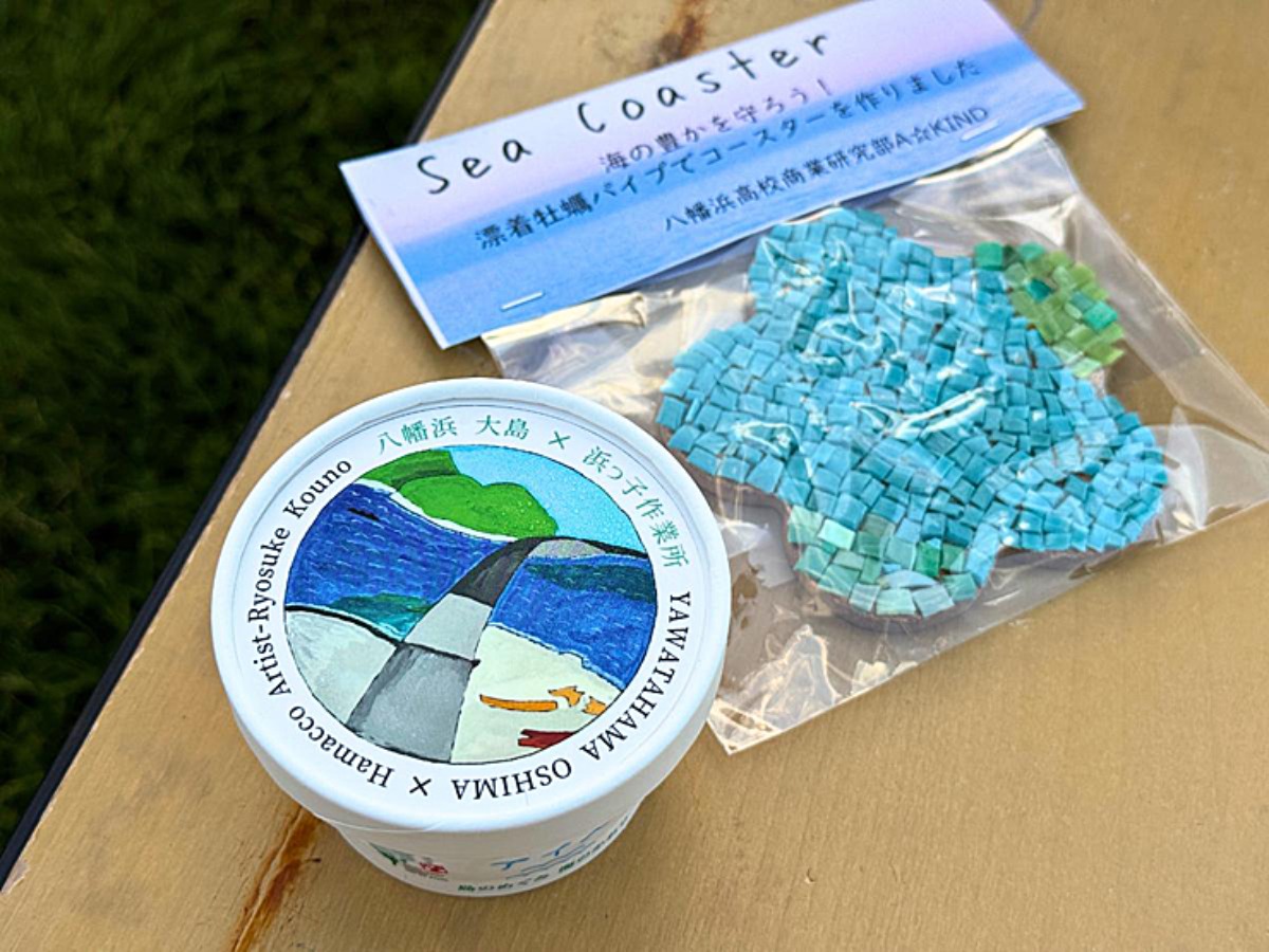 海のアイスや愛南ゴールドジュースなどの飲食物、海ゴミを利用したコースターやヒオウギ貝の殻を使ったカラフルなキーホルダーを手作りして売っていましたよ。