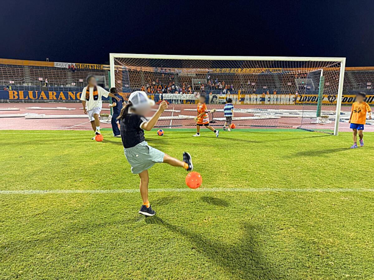 事前予約制(抽選あり)の『試合後ピッチ体験』に当選!芝生はとってもフカフカで走りやすい!