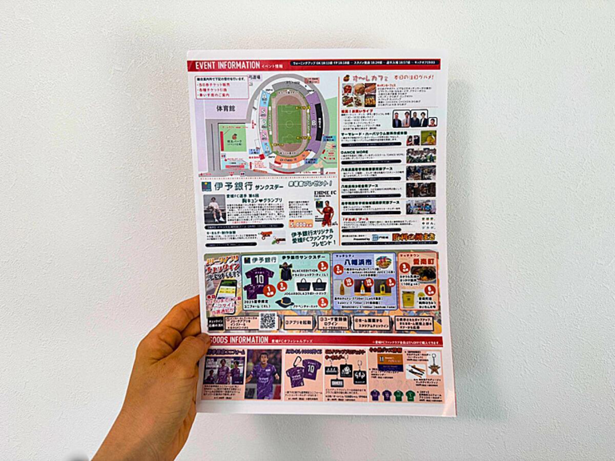 その際に参考になったのが、先述した入場の際に配られる『EHIMEFC』の二つ折りパンフです!