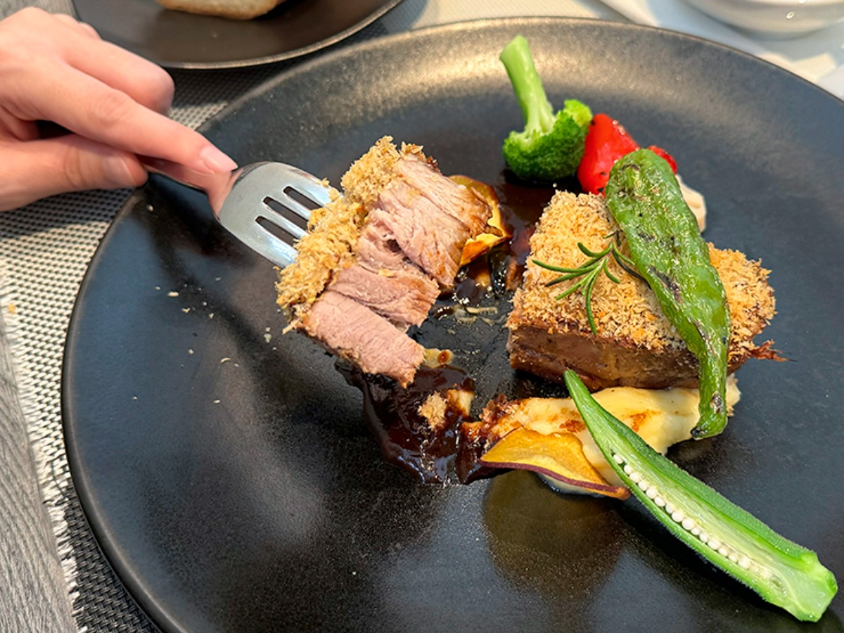 メインプレートは豚バラ肉のパン粉焼きをチョイス。ガッツリと食べ応えのある大きめの豚バラ。おしゃれにまとったパン粉がシャクッ、と良いアクセントになっていました。こんなに厚みのあるお肉をランチで食べられるなんて……。幸せを嚙みしめるように一口一口じっくりと味わっちゃいました♪