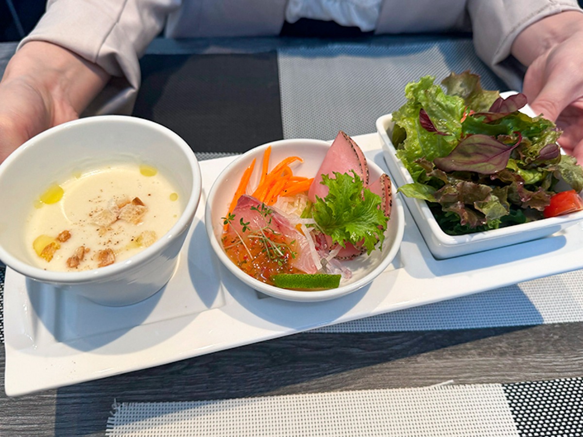 まず運ばれてきたのは、豪華な前菜プレートとスープのセット。右からサラダ、ブリのカルパッチョ、パストラミ、さといもとじゃがいものポタージュです。スープは秋を感じられるこっくり濃厚スープ。舌触りよく、するりと喉を通っていきます。臭みのないブリとパストラミは、すっきり爽やかな風味♪前菜とは思えぬほどのレベルの高さです!