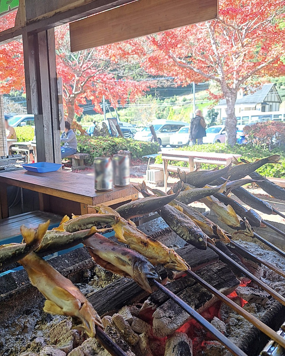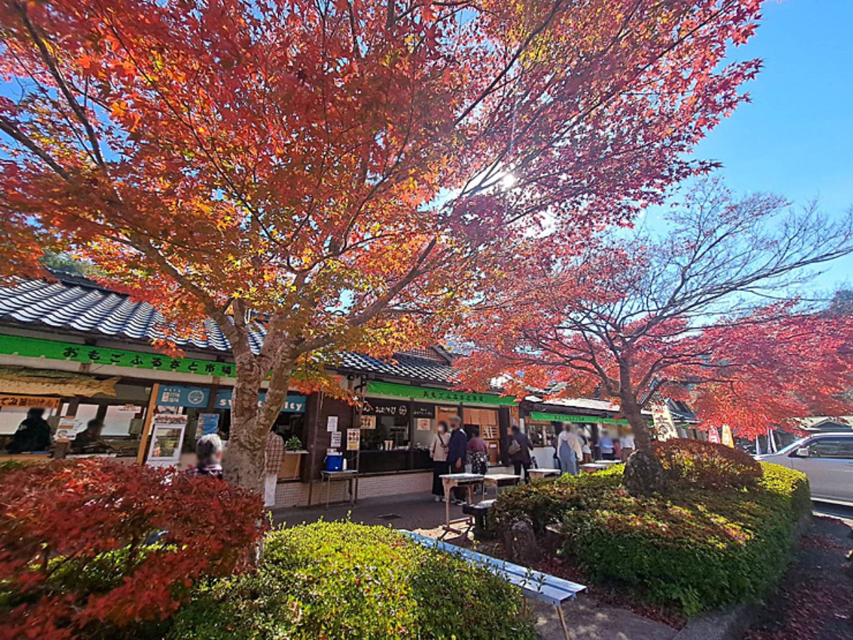 「おもごふるさとの駅」には、5つの飲食店と特産品販売店があります。川魚の塩焼や手づくりこんにゃく、とれたての新鮮野菜など、見逃せない商品がたくさん並んでいます。紅葉狩りの休憩スポットとして、ぜひ利用してくださいね。