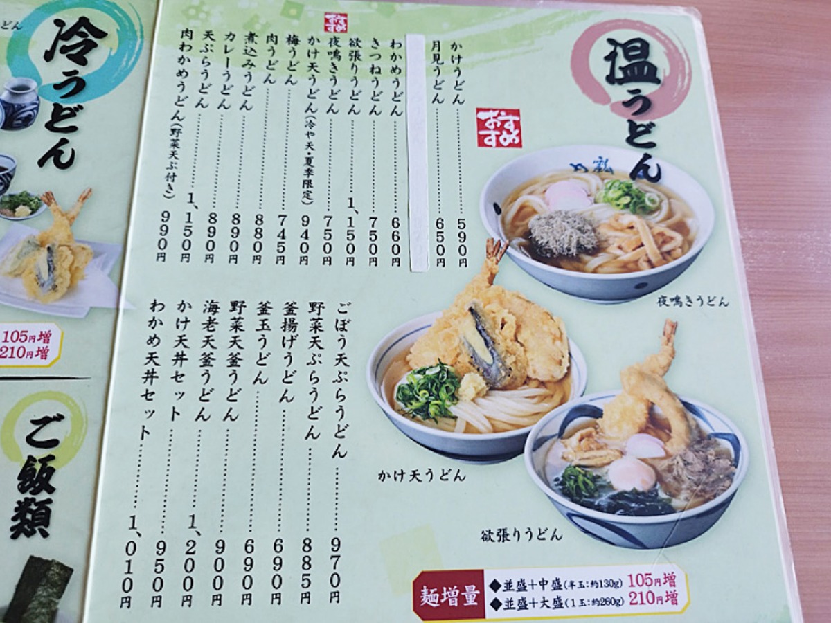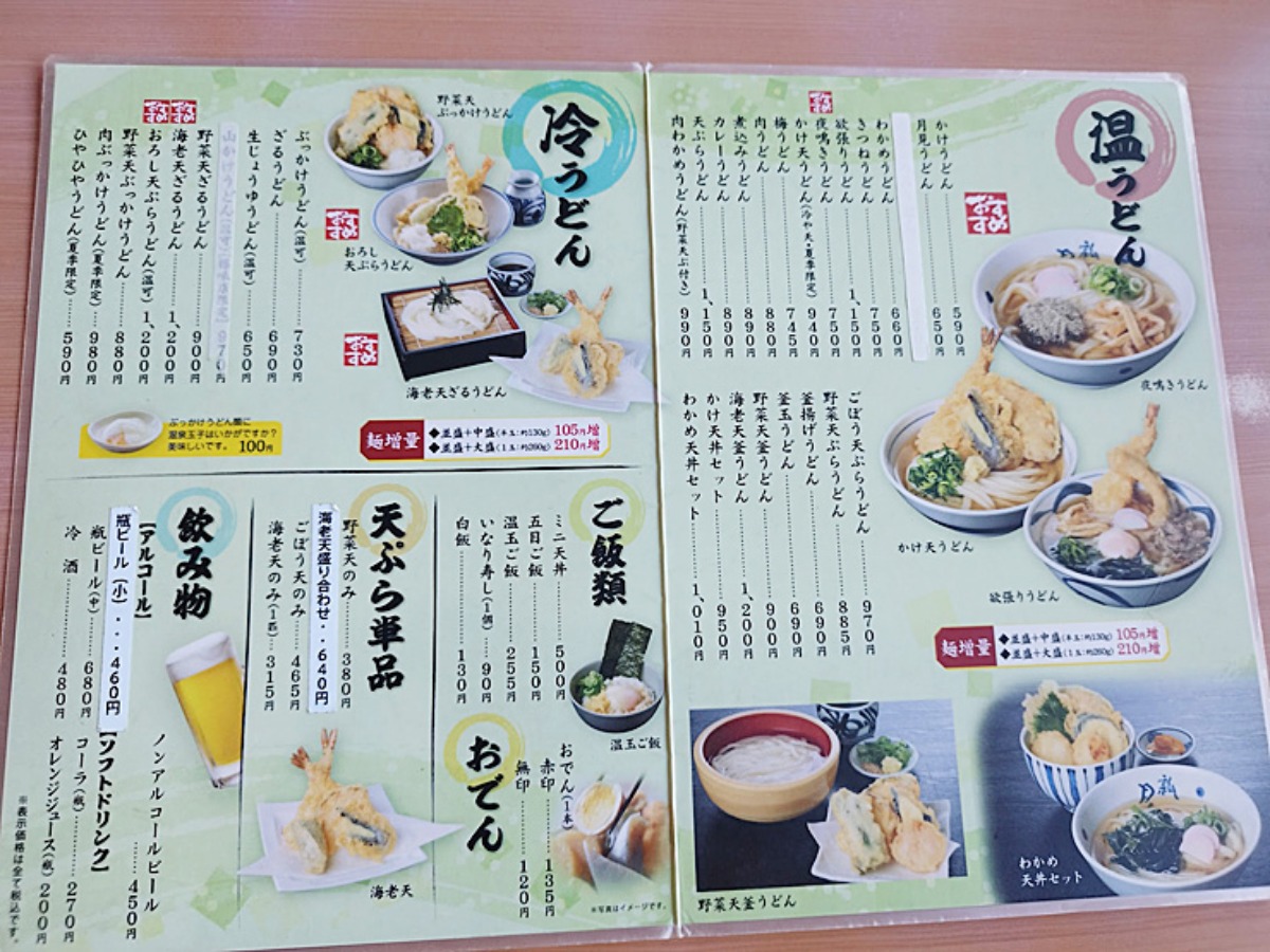 メニュー表には多くの種類のうどんがずらり。どれにしようか迷います。