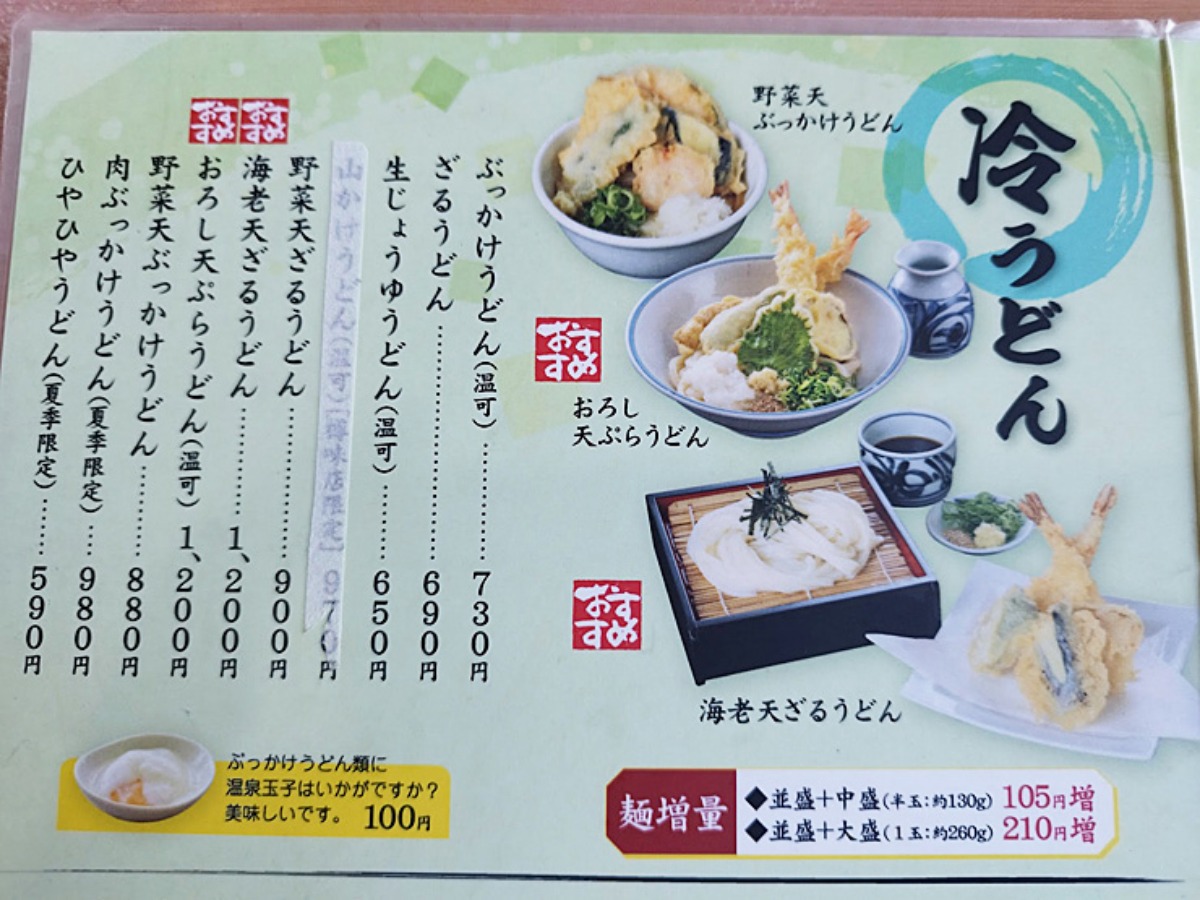 夏にピッタリ、冷うどん。個人的おすすめは野菜天ざるうどんです。どれを選んでも間違いないですよ!