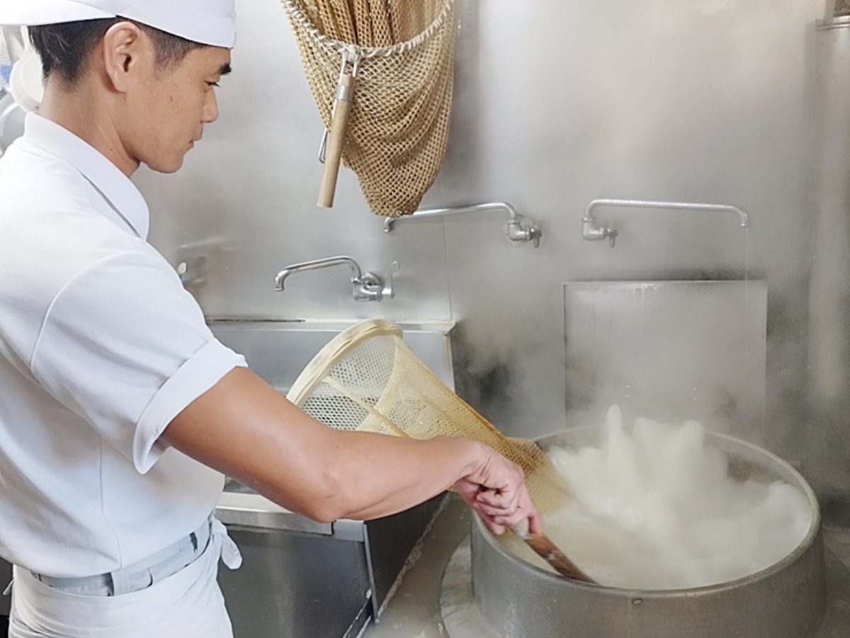 出来上がった麺を大きな釜で茹で揚げる姿も近くで撮影させていただきました。