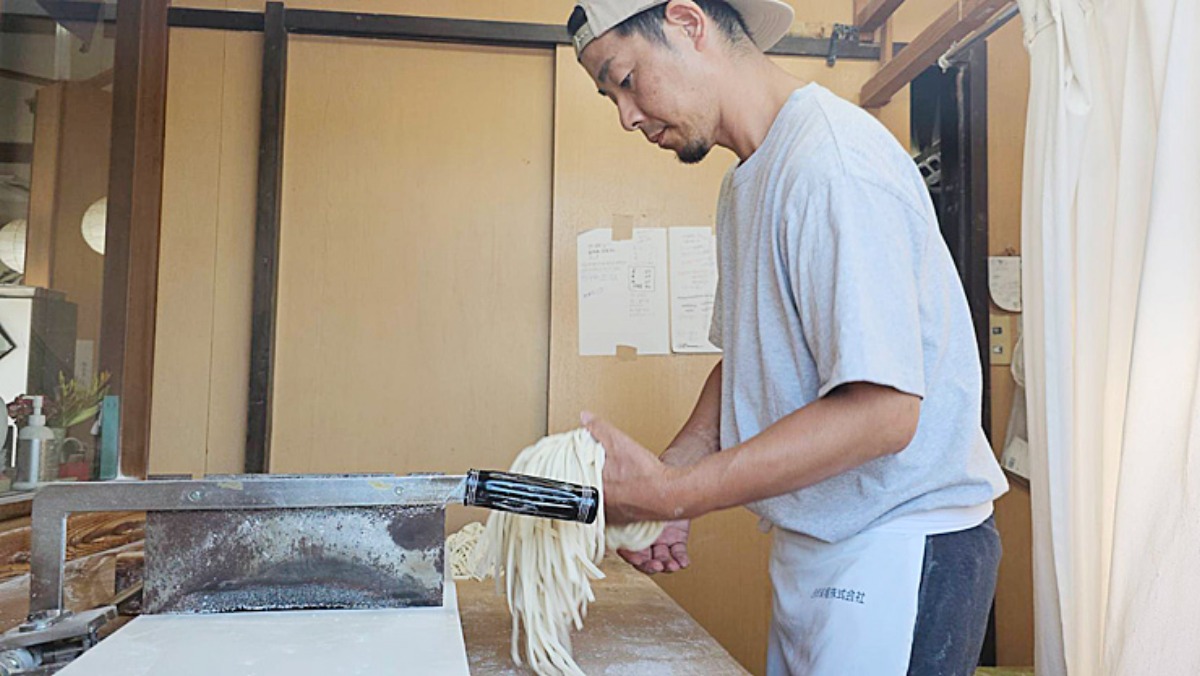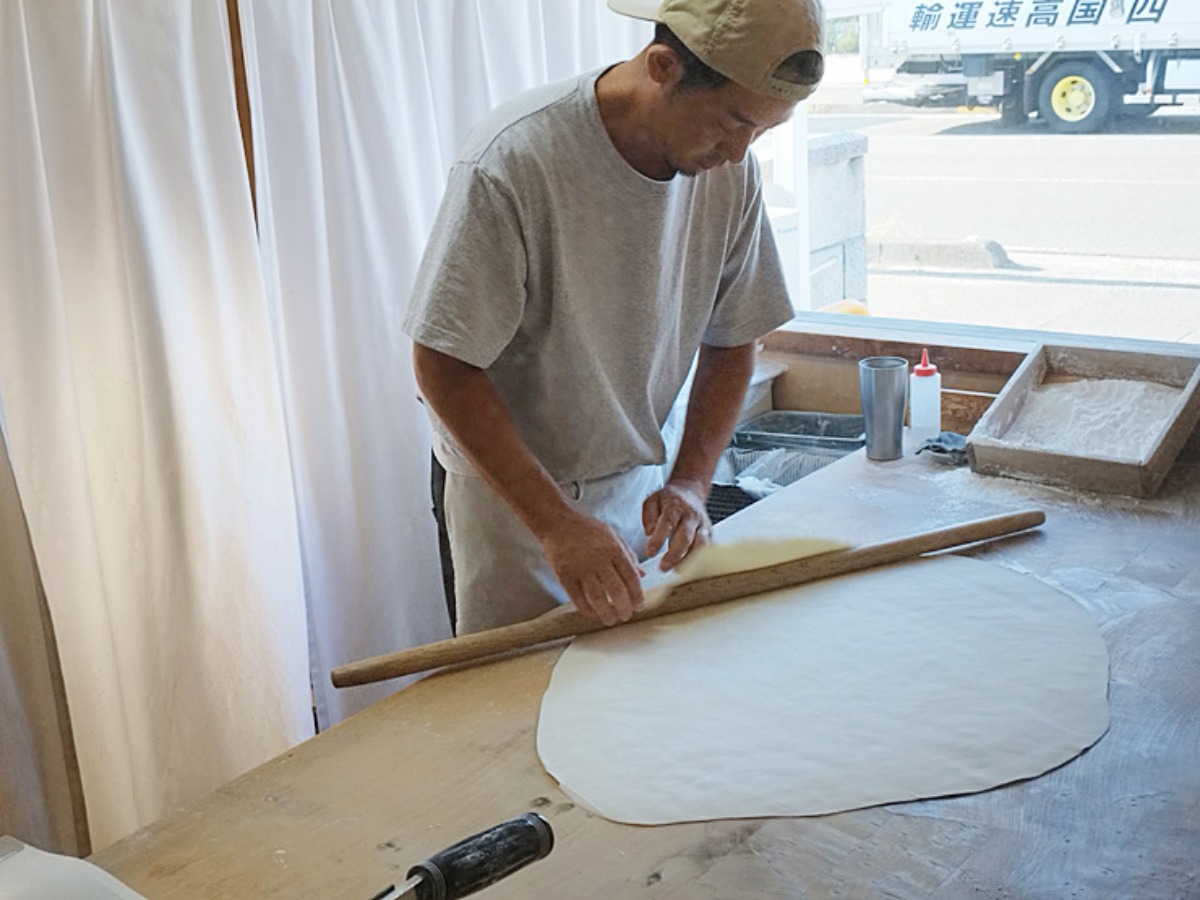 麺棒を使い、またたく間にうどんを錬成する様はこれぞ芸術の域。