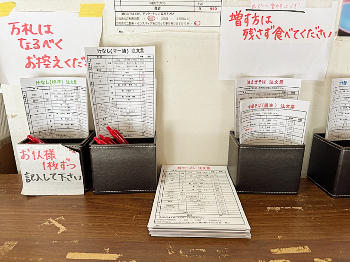 専用の注文票に「麺の量」「野菜の量」「ニンニク」「アブラ」などを記入し、スタッフに渡して前払いする仕組みです。